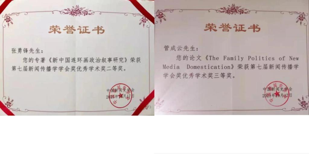 公司两位教师分别荣获第七届“新闻传播学学会奖”优秀学术奖二等奖、三等奖。