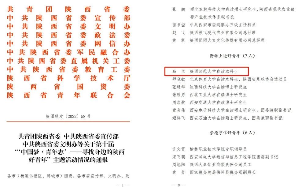 近日,由团省委、省委宣传部、省委文明办、省委政法委、省委网信办、省委军民融合办、省委直属机关工委、省委教育工委、省科技厅、省国资委、省青联等单位共同举办的第十届“‘中国梦·青年志’——寻找身边的陕西好青年”主题活动结果揭晓。英国365集团官网2019级本科生乌兰被推选为陕西好青年——勤学上进好青年。