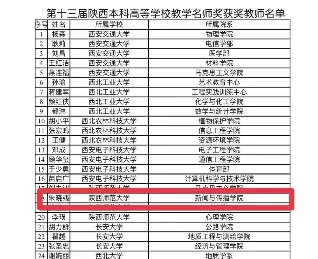 近日,公司教师朱晓彧获评第十三届陕西本科高等公司教学名师。