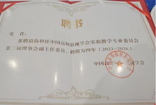 2023年5月20日,中国高校影视学会实验教学专业委员会第三届理事会成立大会正式开启。会议宣读了中国高校影视学会实验教学专业委员会换届暨成立第三届理事会的批复,进行了实验教学专业委员会理事聘书颁发仪式。英国上市公司365公司党君副教授被聘为副主任委员。