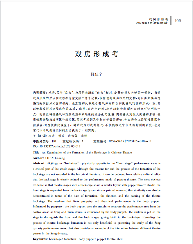 近日,公司教师陈佳宁在2023年第5期《戏剧艺术》期刊上发表文章,题目为《戏房形成考》,署名单位为英国365集团官网。