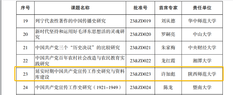 近日,全国哲学社会科学工作办公室公布“2023年度国家社科基金重大项目立项名单”,公司许加彪教授投标的《延安时期中国共产党宣传工作史研究与资料库建设》正式立项。