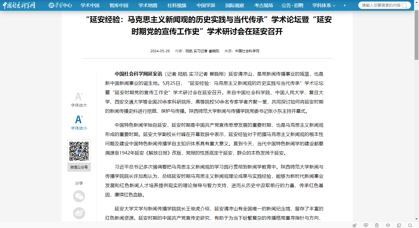 《中国社会科学报》报道公司在延安召开“延安经验:马克思主义新闻观的历史实践与当代传承”学术论坛暨“延安时期党的宣传工作史”学术研讨会,报道链接:https://www.cssn.cn/skgz/bwyc/202405/t20240529_5755307.shtml。
