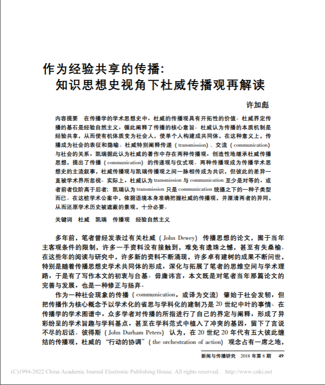在传播学的学术思想史中,杜威的传播观具有开拓性的价值。杜威界定传播的基石是经验自然主义,循此阐释了传播的核心意旨。杜威认为传播的本质机制是经验共享,从而使有机体质变为社会人,使单个人构建成共同体,在这种意义上,传播成为社会的表征和隐喻。杜威特别阐释传递(transmission)、交流(communication)与社会的关系,凯瑞据此认为杜威的著作中存在两种传播观,创造性地继承杜威传播思想,提出了传播(communication)的传递观与仪式观。两种传播观成为传播学术思想史的主流叙事,杜威传播观与凯瑞传播观之间一脉相传成为共识,但彼此的差异一直被学术界所忽视。实际上,杜威认为transmission与communication至少是对等的,或者前者位阶高于后者;凯瑞认为transmission只是communication统摄之下的一种子类型而已。在这桩学术公案中,依据语境本身准确把握杜威的传播观,并厘清两者的异同,从而还原学术历史被遮蔽的景观,十分必要。