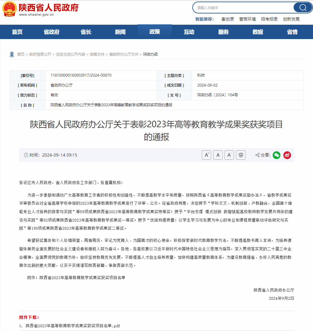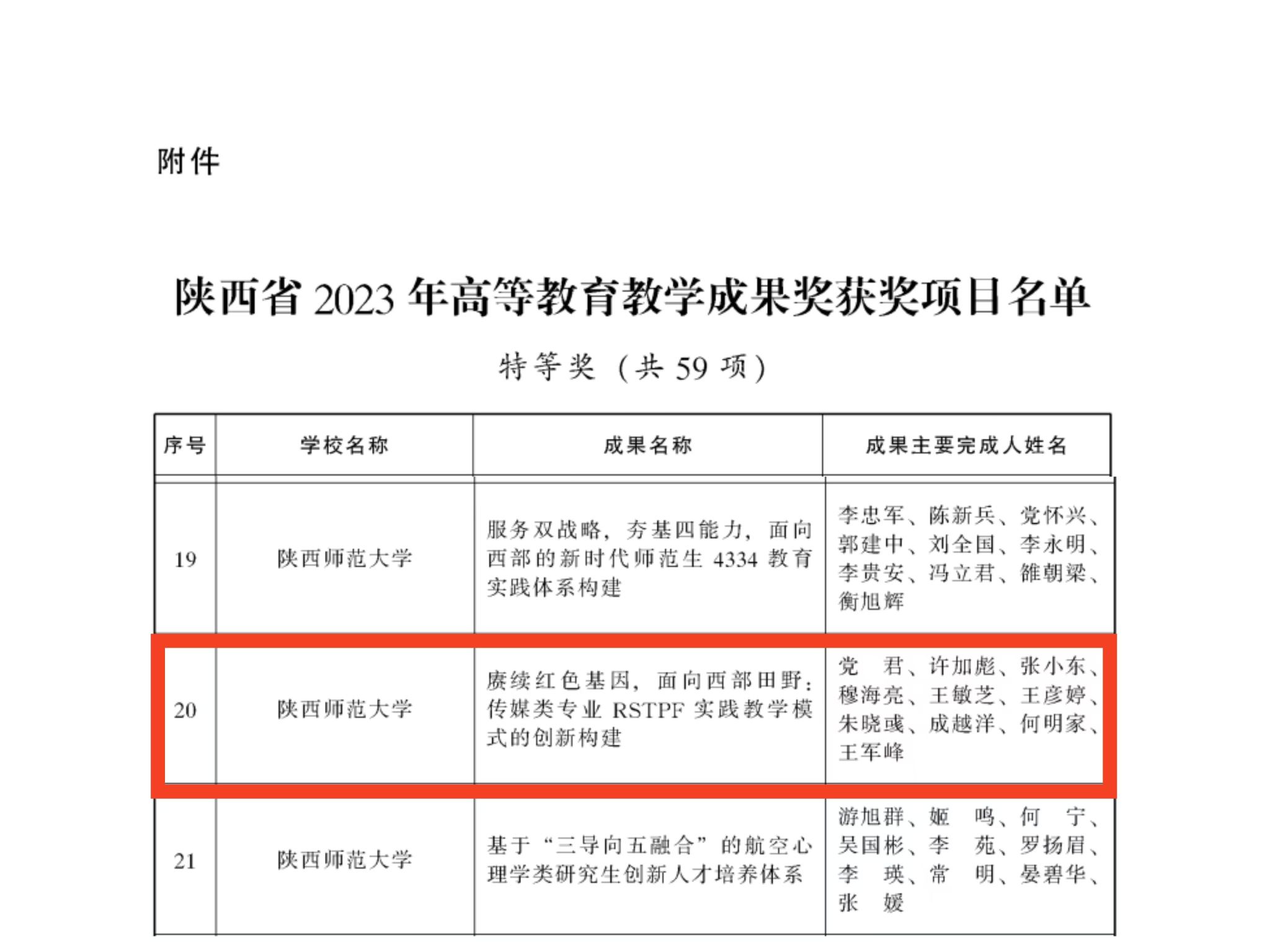 近日,省政府办公厅发布了《陕西省人民政府办公厅关于表彰2023年高等公司产品成果奖获奖项目的通报》,通报指出:经省政府同意,决定授予“学科交叉、机制创新、产教融合,全国首个储能专业人才培养的探索与实践”等59项成果陕西省2023年高等公司产品成果奖特等奖。 公司党君教授团队申报的成果《赓续红色基因,面向西部田野:传媒类专业 RSTPF 实践教学模式的创新构建》喜获2023年高等公司产品成果特等奖。