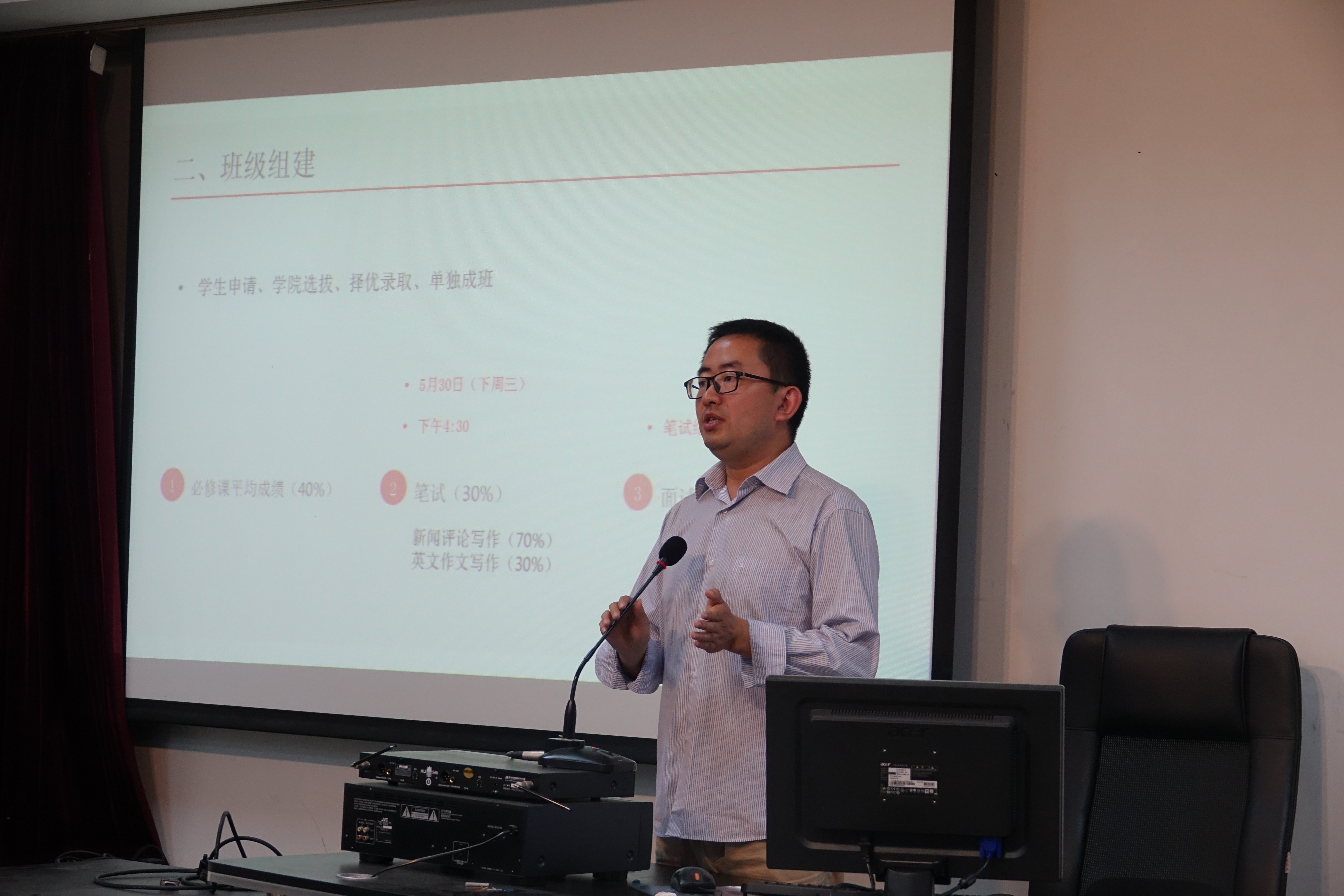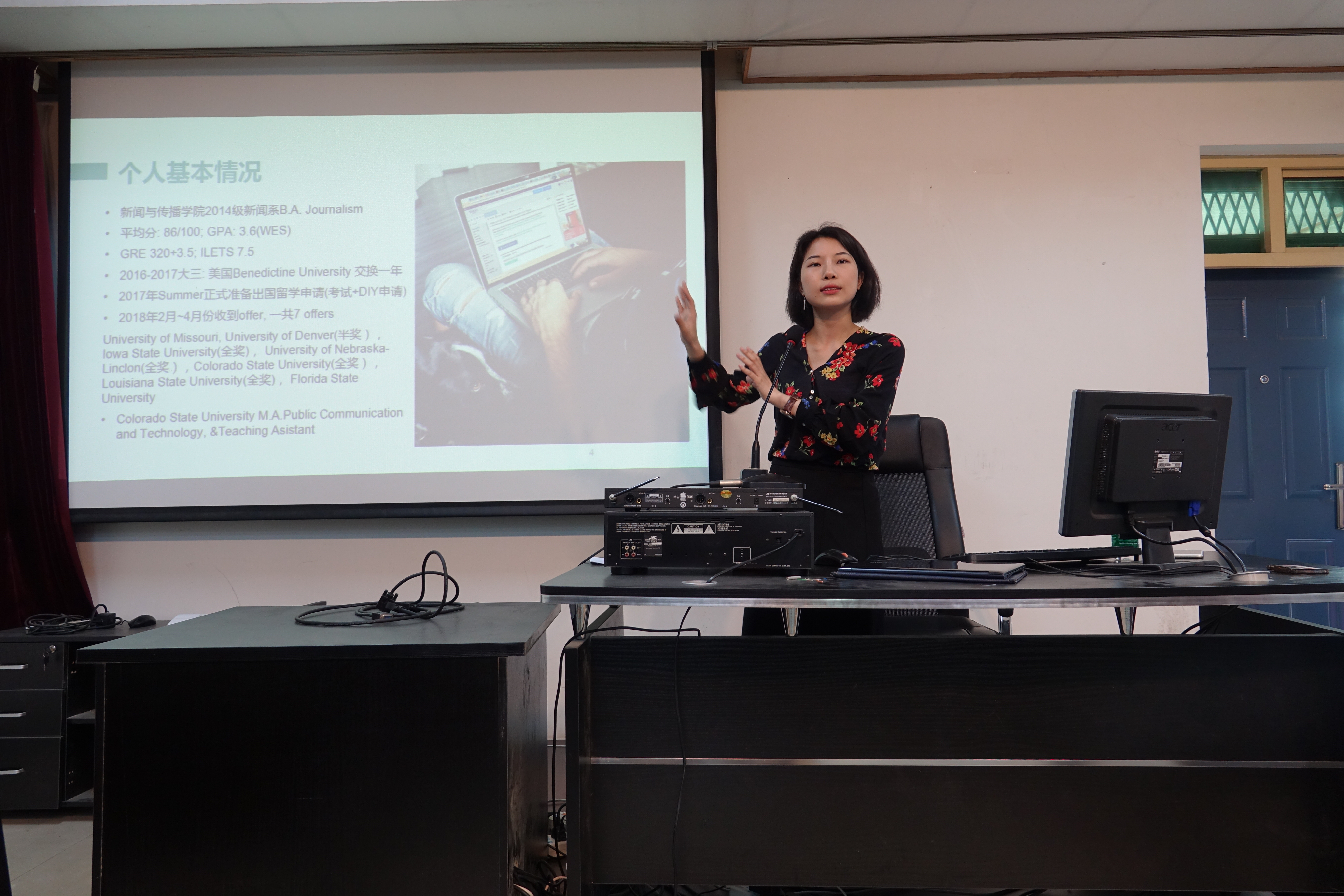 5月25日上午10点,公司于逸夫科技信息楼三层报告厅召开了2017级斯诺卓越新闻人才班选拔方案宣讲暨国外名校申请经验交流会。会议由周宏刚老师主持,他向同学们宣讲了斯诺班选拔方案。2014级新闻学专业的朱丽娜同学作为主讲人分享了国外名校申请经验和英语学习的方法。公司17级新闻传播学大类的同学们参与了此次交流会。