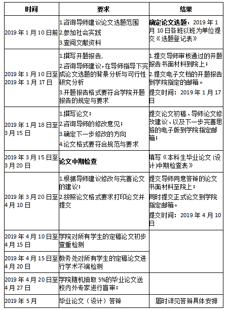 2019年4月10日:提交定稿论文,进行学术不端检测;以上时间未按时提交一律视为未完成;