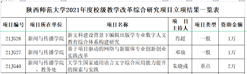 本次立项工作中,公司共申报6项项目。其中,3个项目获批20021年度校级课堂教学模式创新研究项目(其中重点项目2项,一般项目1项);2个项目获批2021年度校级教学改革综合研究一般项目,1个项目获批2021年度校级公共艺术教育专项立项一般项目。