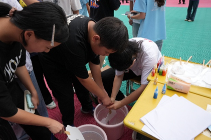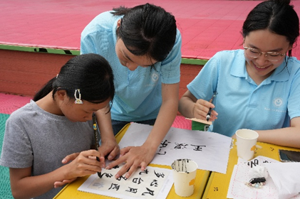 “乡村的孩子,更需要在文化里找到根。我们要带着他们一起在乡土里发现文化的力量”,实践队员母培瑶如是说。在传统文化节活动上,营员们现场沉浸式体验传统文化的魅力。漆扇区前排起长队,营员们通过自制漆扇展现天马行空的想象力和创造力;书法桌前,营员们认认真真地临摹古文,一笔一划间尽显风采;在螺钿制作区,营员们低头制作,每一叶钿片都承载着时光流转的光泽;民族体育区里,中国鼓、毽子、蹴鞠等等“穿越时空”的活动,让研学营师生共享民族文化带来的欢声笑语。