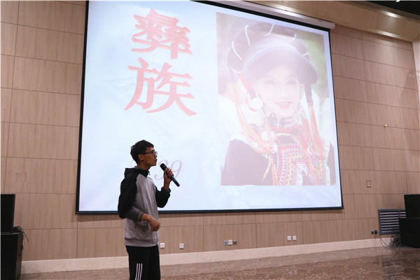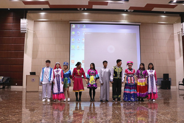 会上,少数民族同学身着靓丽的民族服饰向在场老师、同学介绍了各民族的文化风情,展示了富有民族特色的服装、音乐、语言、文字等。在活动中,同学们全方位的了解了不同民族间的文化、特色,还近距离观看了民族特色服饰。活动期间,少数民族同学为大家表演了民族服饰走秀,气氛温暖、和睦。随后又邀请在场同学进行了具有民族特色的互动游戏,现场老师和同学都能够积极参与其中,各民族同学之间相处融洽、气氛热烈。