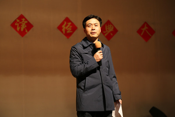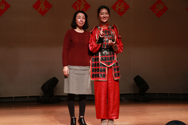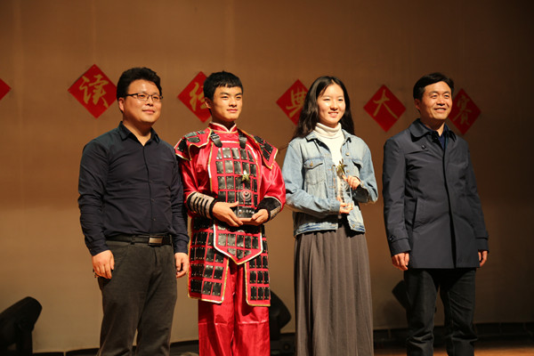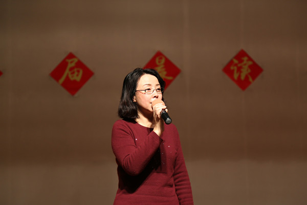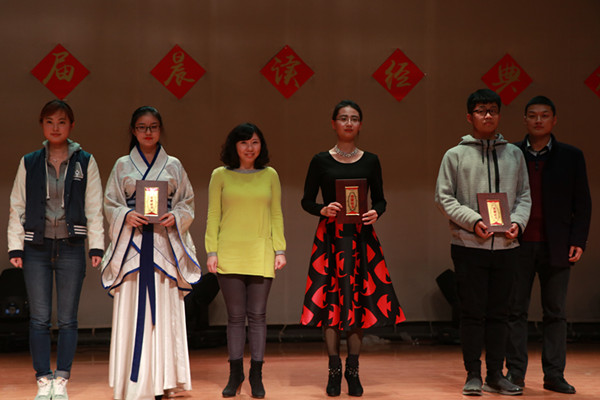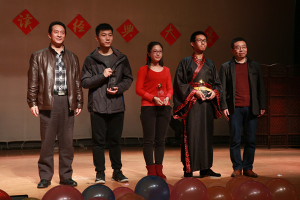 节目表演结束之后,公司党委书记黄玲老师发表讲话,她说此次大赛使她回忆起自己的大学时光和青葱岁月,十分的感动,同时也称赞了同学们的精彩演出,祝愿晨读经典大赛越办越好。接下来,公司副经理许加彪教授发表讲话,对于本次大赛给予了高度评价,同时也对新传院未来的发展给予美好的祝福。最后文公司中国古典文献学博士生导师周淑萍老师宣读比赛结果:优秀奖为《正气歌》、《汉韵》、《花木兰》;三等奖为《春江花月夜》、《破窑赋》、《诗经诵》;二等奖为《长恨歌》《红楼梦诗词吟赋》;《杨门女将》节目获得了本次大赛的一等奖。