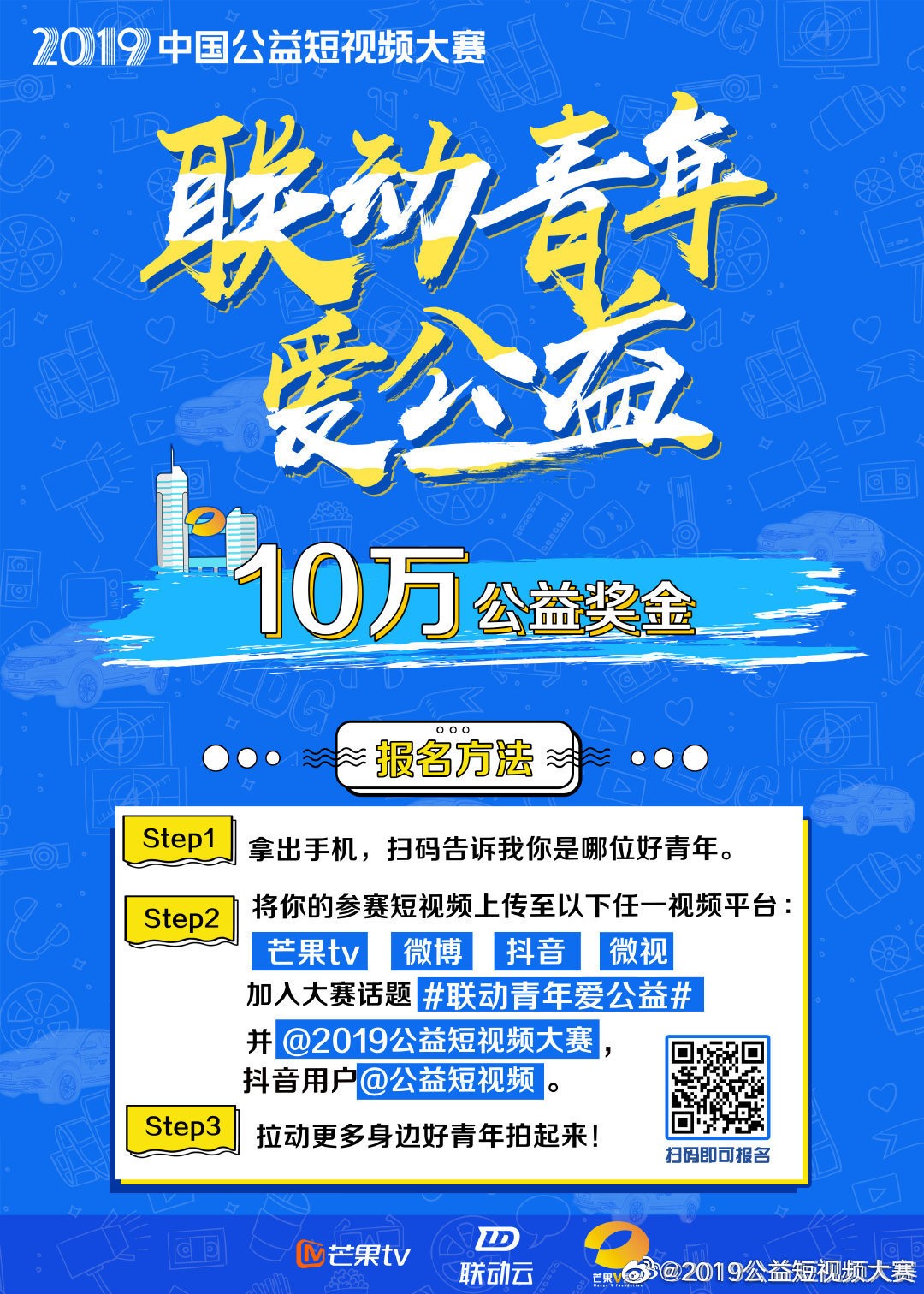 2019年度公益短视频大赛以“联动青年爱公益”为主题,旨在弘扬时代精神,展示美好情怀,传播正能量。本大赛也是芒果TV“十人千万”计划的选才通道,在本大赛成绩优异者不单能获得大奖,还可参与到“十人千万”计划的角逐中,争夺100万芒果TV专项拍摄启动资金。活动承办方芒果TV和芒果V基金希望在用影像记录时光的年代,鼓励青少年用短视频记录人间真善美,传播社会正能量,用镜头展现年青人与新时代的青春风貌。
