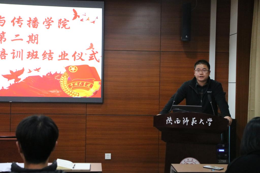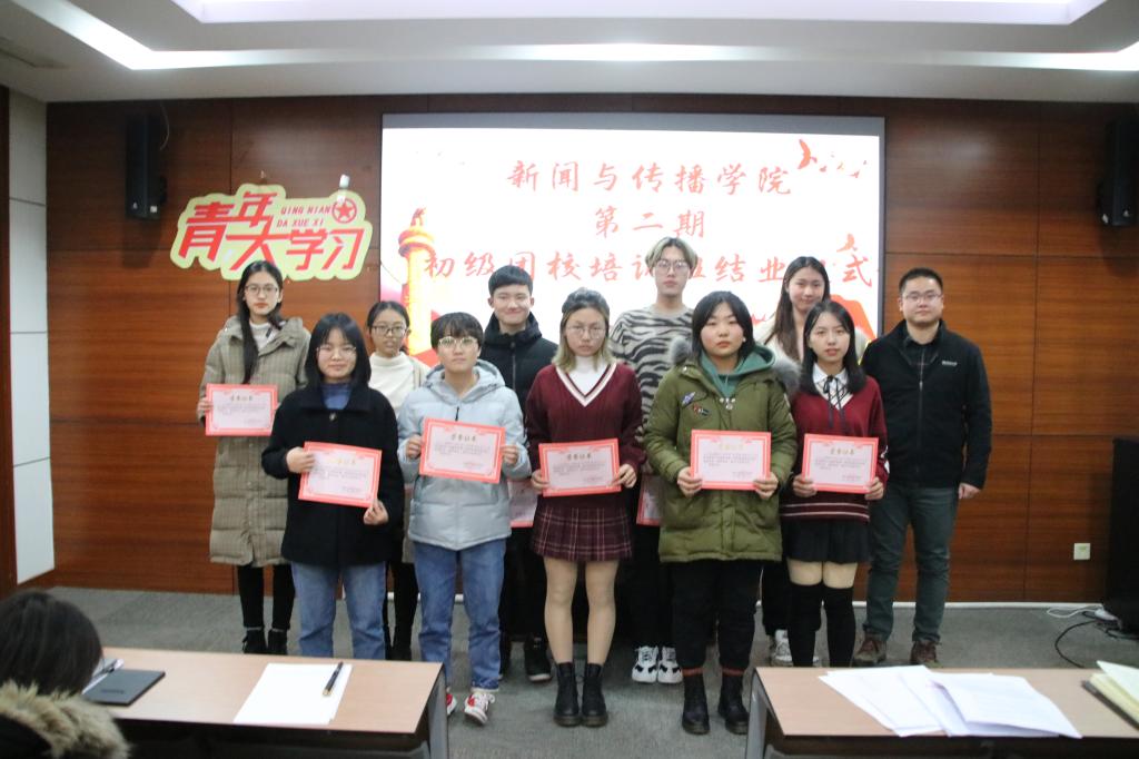 观看专题节目后,团委副书记胡琼月同学回顾并总结了本期初级团校培训班的学习内容。第二期初级团校培训班内容充实、形式创新,首次推行学分制,完善学员考核评定制度。从理论学习的出勤、自主研学的表现、外出实践的参与度、学习笔记的提交等方面根据学分完成情况对学员进行考核,最终共有41位学员顺利结业,并评选出了11位优秀学员。团委书记刘炜老师现场宣读优秀学员名单并为他们颁发证书,合影留念。