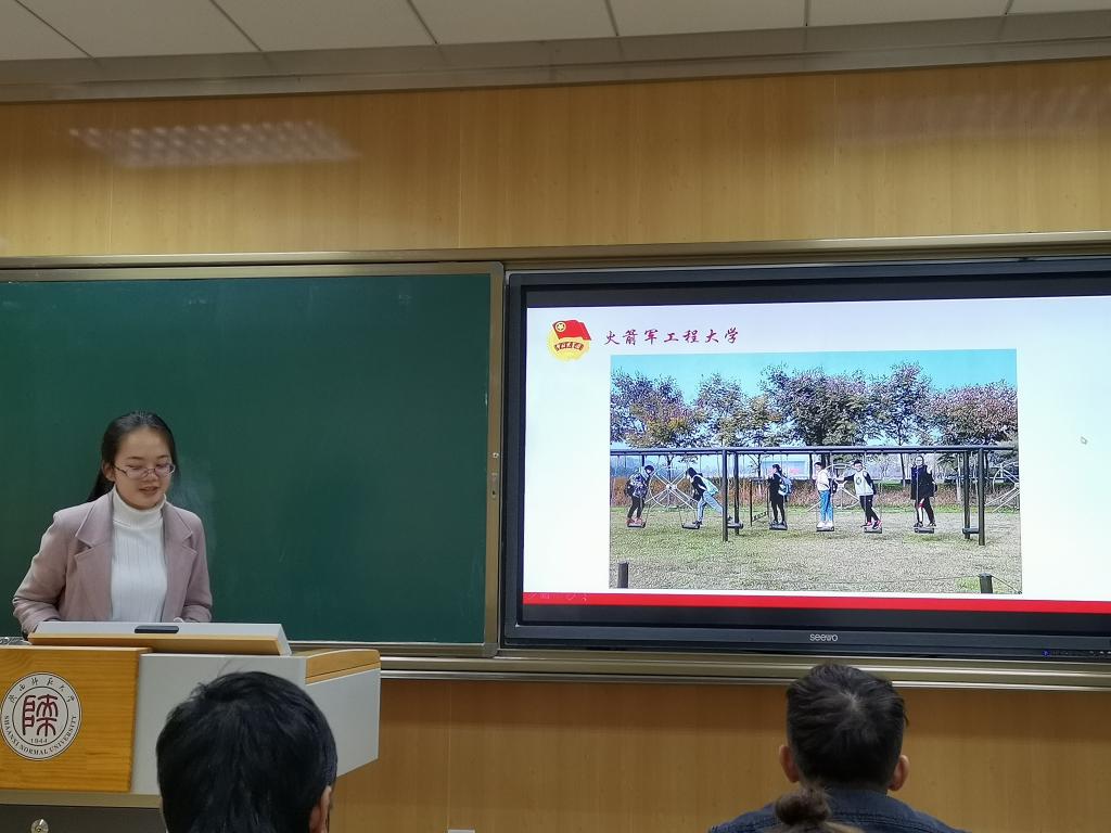 “了解英雄的精神就是忠实传承和弘扬自己身上涵养的民族气节。”19级新传二班的黄莉晴同学分享了她参观火箭军工程大学的感想。随后,团支书以火箭军工程大学为引,带领团支部成员了解中国第一个以人民英雄名字命名的连队——杨根思连以及中国维和部队。