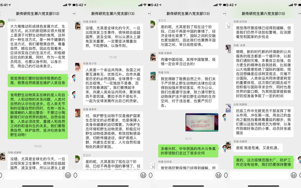 第六党支部围绕“防控疫情,研究生党员在行动”,举行线上学习活动。支部书记王菲以PPT的形式,从传媒人的角度出发带向大家进行了科普和倡议,活动结束后支部成员纷纷表示感触很深,发表了各自的感想和体会。