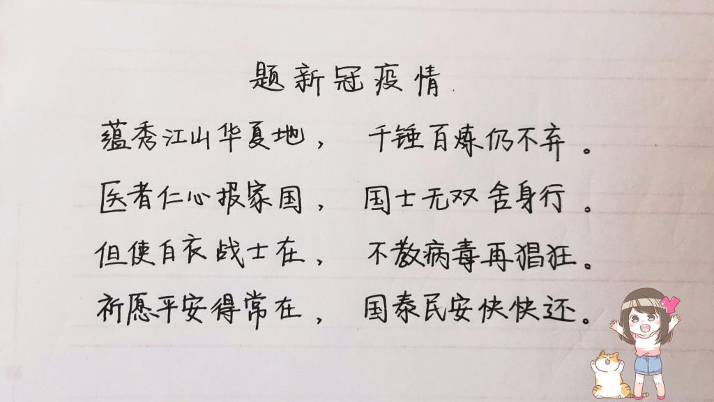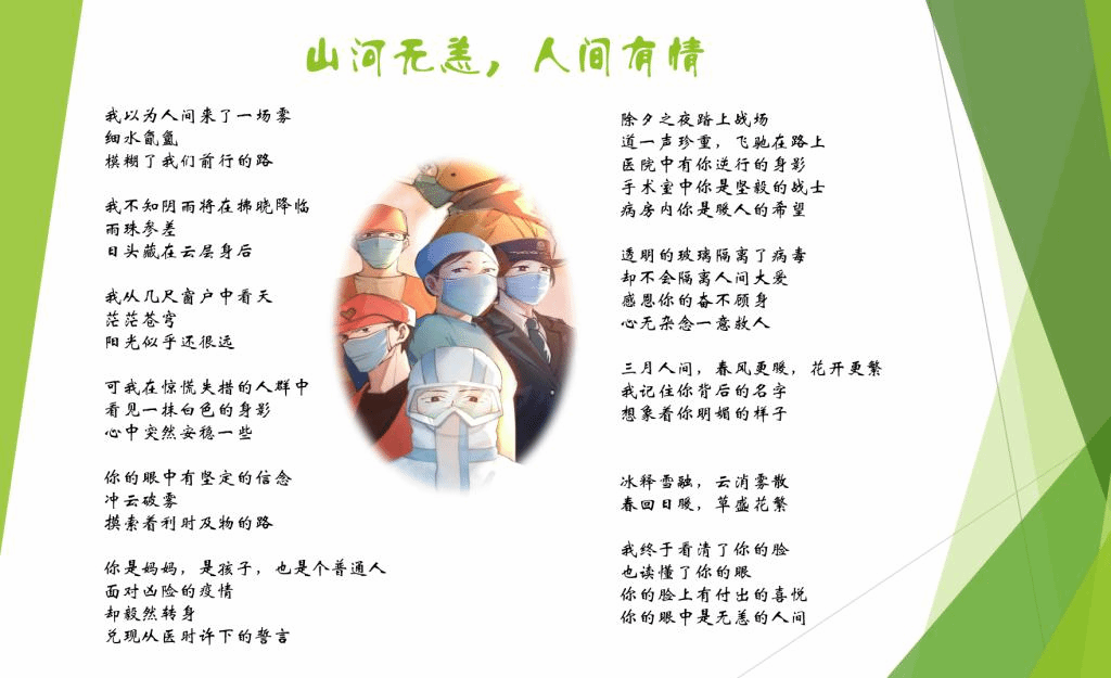 为了更好地学习弘扬逆行者们的奉献精神,同学们按照预定分组对抗疫楷模们的事迹和精神进行了深入的学习,并以小组为单位完成了一份致敬逆行者的作品。同学们的作品形式多样,从古代律诗到现代新诗,再从图片海报到新媒体短视频。同学们充分结合专业特长,不仅表达出对逆行者们的感激与敬仰,也体现出过硬的专业素养。