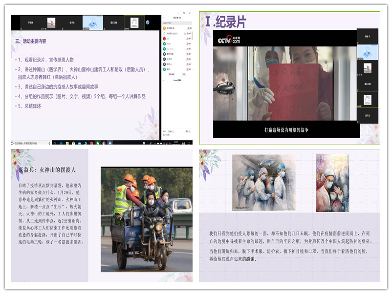 3月27日下午,2019级新传1班举办了“终于看清你的脸,你的眼里有人间”线上主题班会,呼唤新传学子共怀感恩之情,向所有奋战在抗击疫情第一线的工作人员表达崇高的敬意。辅导员刘炜老师和全班同学一起观视频、听故事、行感恩。