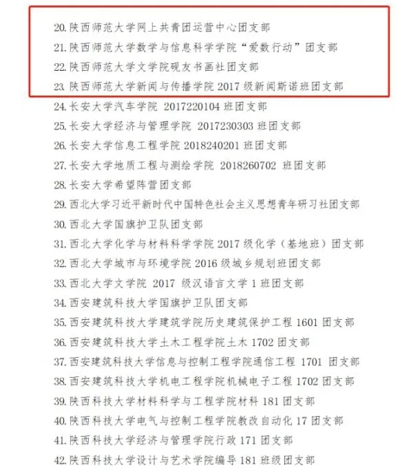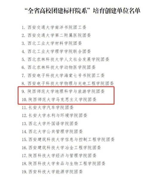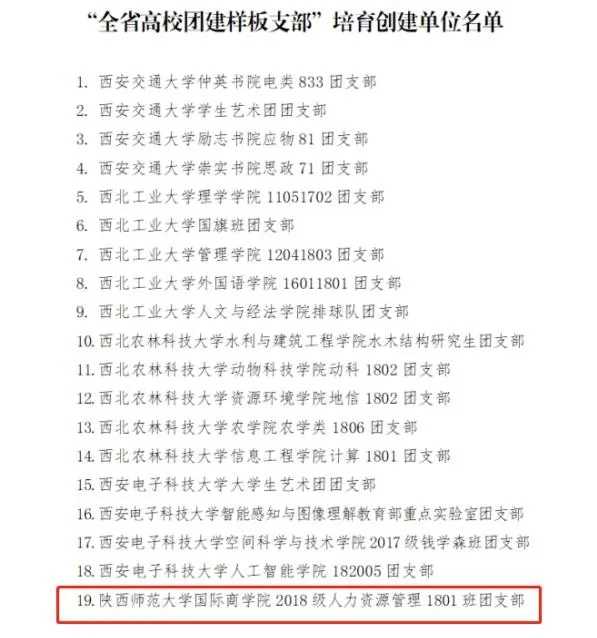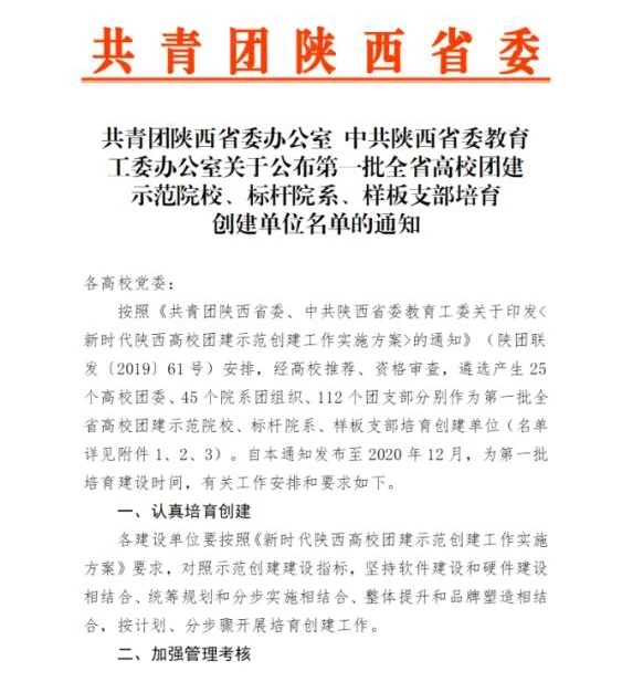 近日,在共青团陕西省委、中共陕西省委教育工委公布的第一批全省高校团建标杆院系和样板支部培育创建名单中,公司团委入选“全省高校团建示范院校”培育创建单位名单,公司2017新闻斯诺班团支部入选“全省高校团建样板支部”培育创建单位名单。