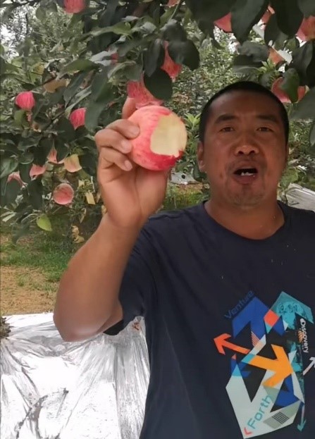 主播花椒哥是一名朴实的陕西汉子,皮肤黝黑、笑容真诚,说话耿直利索,一口地道的陕西方言让直播间的大伙们倍感亲切。他乐呵呵地在果园里来回转悠,转动手机镜头,让观众全方位观看苹果色泽。他时而拽个苹果下来,咔嚓一声一掰两半,吃得满口果香;时而躺在苹果树下,抬头便是郁郁葱葱的枝叶,伸手就可摘到圆滚滚的苹果。