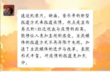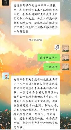 如何分门别类又不失逻辑地查找资料成为了第一个难题。由于疫情每一阶段各有特点,相对应的报道就会各有千秋。经过讨论,我们发现以时间为线既不会造成任务分配混乱,也便于进行研究不同阶段的报道特点。于是研究小组成员们分为三组,分别负责疫情初期、中期、后期的主流媒体的报道资料的查找和研究。最终经过十天的大面积资料查找,大家讨论后得出初步结论:传统报道文风严肃,而央视抖音号追求情感共鸣,背景音乐普遍存在并且旋律动人。时而严肃,时而幽默,世界外交风云和搞笑轶事兼有,每个视频都很有意义,普通民众和各国领导人兼容,但传递的信息都不俗,充满正能量,很接地气。