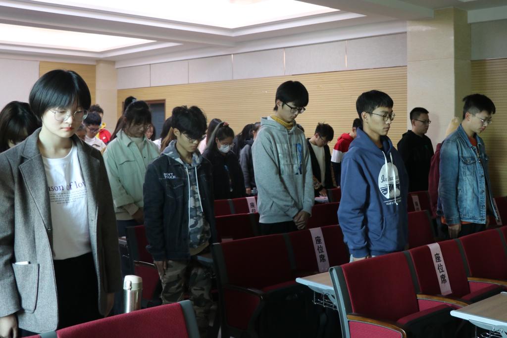 十时整,国歌奏响,同学们神情严肃、目光坚定,全体起立高唱国歌。