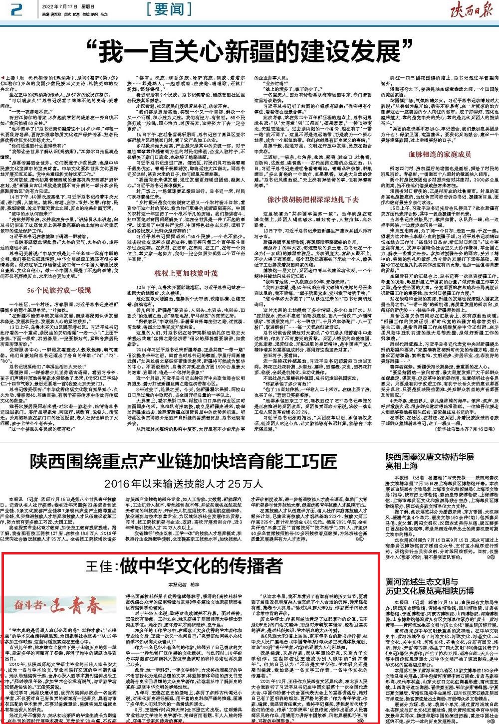 2022年7月17日,《陕西日报》刊登题为“王佳:做中华文化的传播者”的文章,报道了公司毕业生王佳的故事。