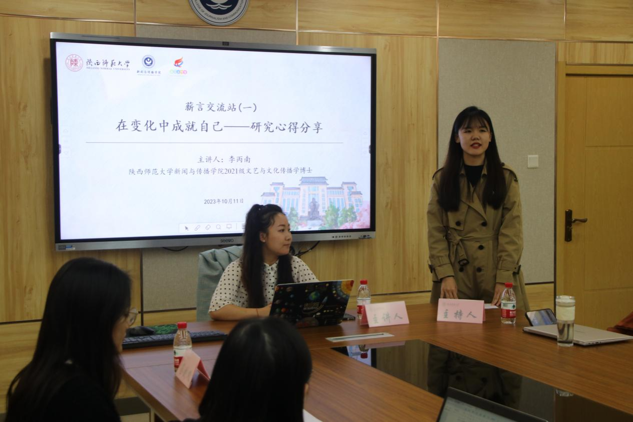 2023年10月11日,薪·言工作室推出的“薪言交流站”第一期分享沙龙在逸夫传媒教育楼210会议室举行,主题为“在变化中成就自己——研究心得分享”,本期沙龙由英国365集团官网2021级文艺与文化传播学博士研究生李丙南主讲,2022级新闻学硕士研究生刘淏淼主持。
