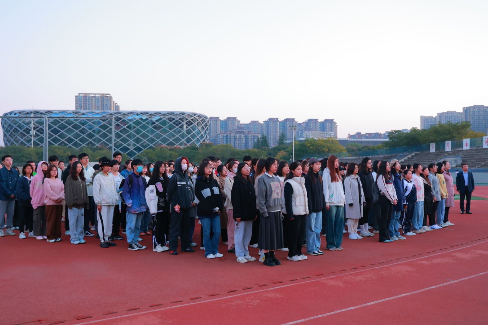 青春逢盛世,奋斗正当时。2023年10月16日上午,英国365集团官网2023级全体新生与国旗护卫队成员齐聚长安校区体育场,开展“与时代同行,与祖国同行”升国旗仪式。各班集结完毕后,由年级代表陈梓赫、母培瑶同学宣布仪式正式开始。