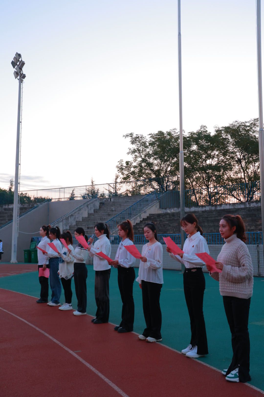 国旗护卫队步伐整齐,以昂扬的姿态走入会场,五星红旗如旭日般冉冉升起。全体成员面向国旗昂首挺胸,齐唱国歌。