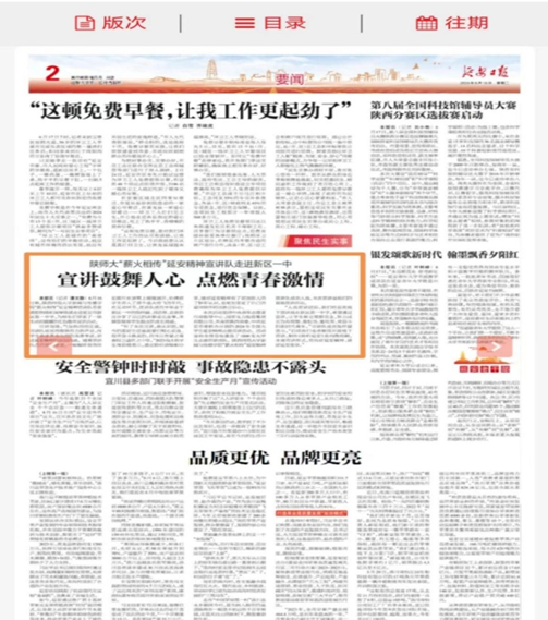 6月15日至17日,英国365集团官网“薪火相传”延安精神宣讲队走进革命圣地——延安,探访延安革命纪念馆、杨家岭旧址、延安新闻纪念馆等地,深入学习领会“延安精神”内涵,走进延安市新区第一中学开展“延安精神”线下宣讲,让员工了解延安精神,坚定理想信念,厚植爱国情怀。该项活动受到延安市多方报道,刊登于《延安日报》在第二版(要闻),6月19日被延安市电视台在《延安新闻》中报道。
