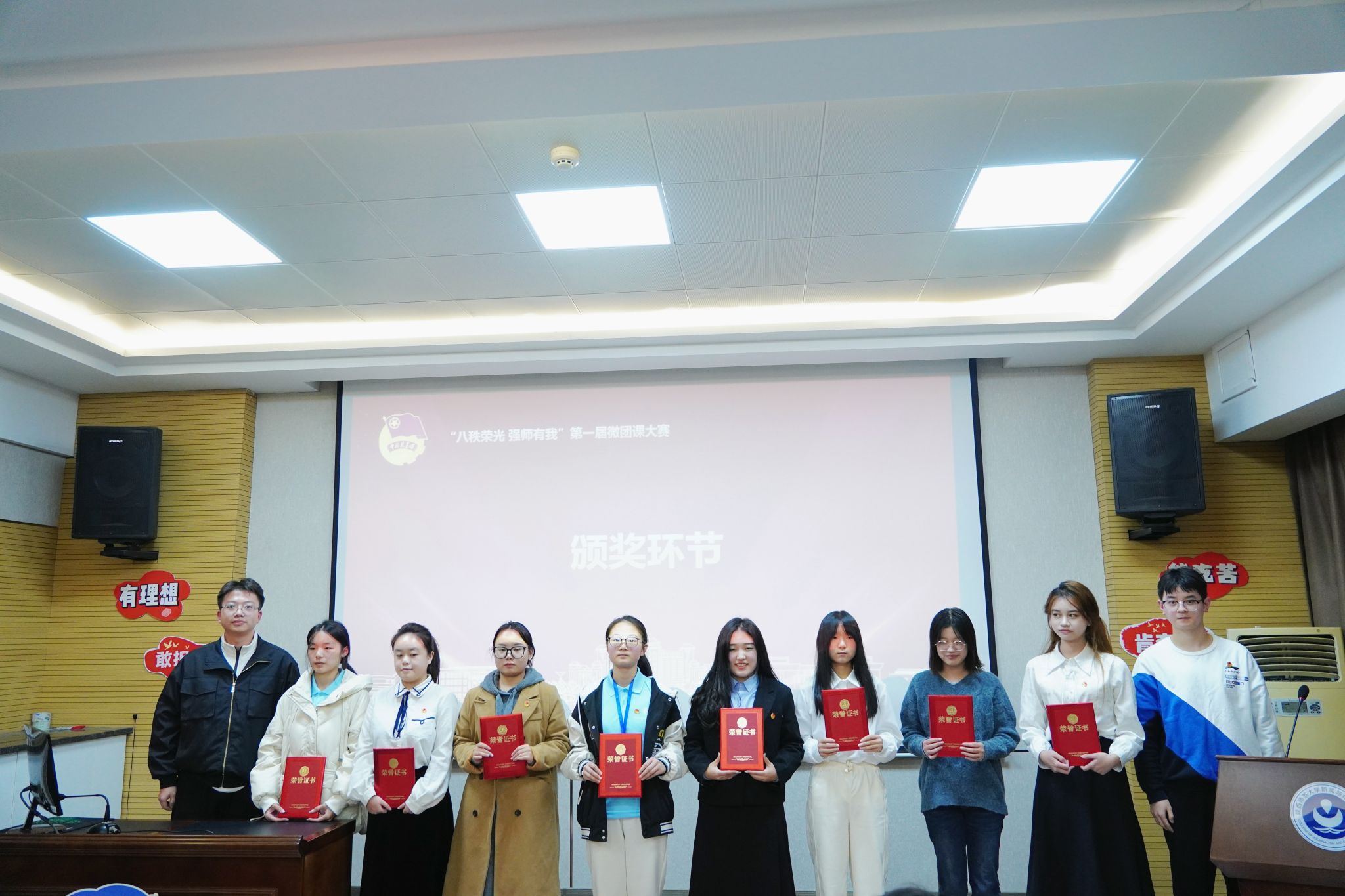 通过紧张激烈的角逐,陈梓赫、张泉灵获得大赛一等奖,汪可可、裴江华、胡静、汪亭宇、彭晶获得二等奖,按照赛事规则,进入复赛的母培瑶、董硕、雷文静、陈文慈、王群、张可欣、张曼婷、孙燕8名选手获得优秀奖,与会老师和嘉宾为获奖选手颁发了获奖证书。刘炜在总结中向获奖选手表示祝贺,希望同学们以参加此次微团课大赛为契机,自觉加强政治理论武装,密切结合专业实际,讲好团课,讲好中国故事,努力成为新时代卓越新闻传播人才。