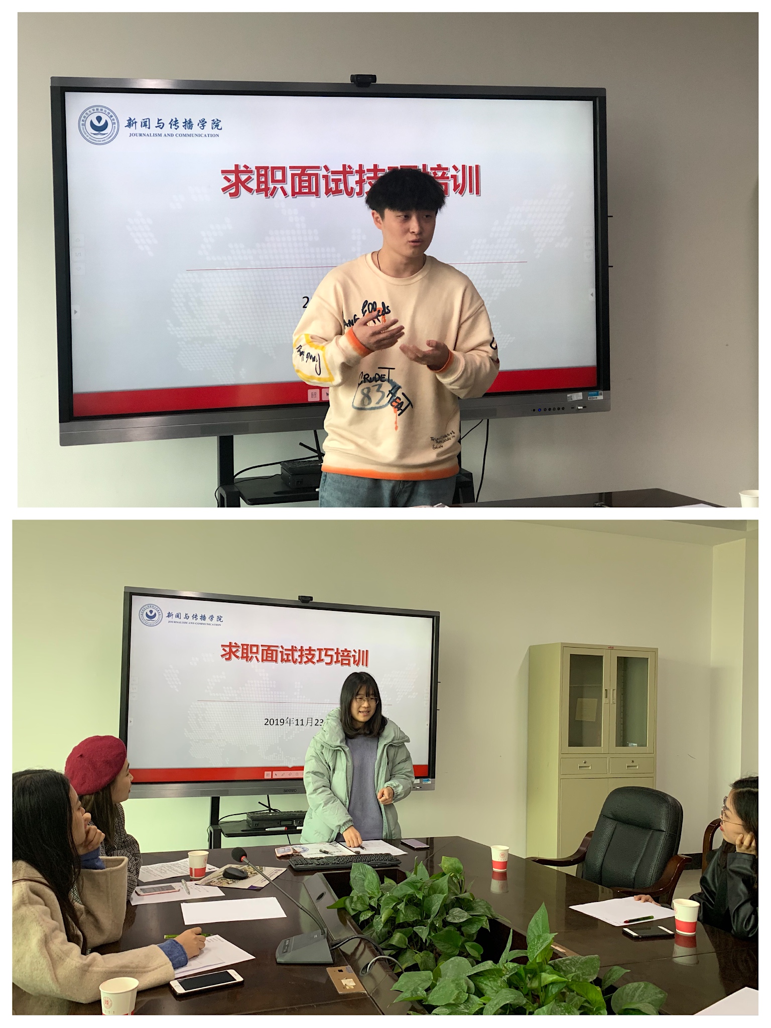 在经验交流分享环节,2016级播音与主持艺术专业员工王阳结合个人经验分享了面试中语言表达的技巧,以及问答环节预设问题的准备内容,同时他认为自信真诚的态度是面试成功的重要因素。2016级广播电视编导专业员工王丽娟分享了自己求职成功的经历,并就面试常考问题做了归类,对签约时的注意事项做了详细讲解。