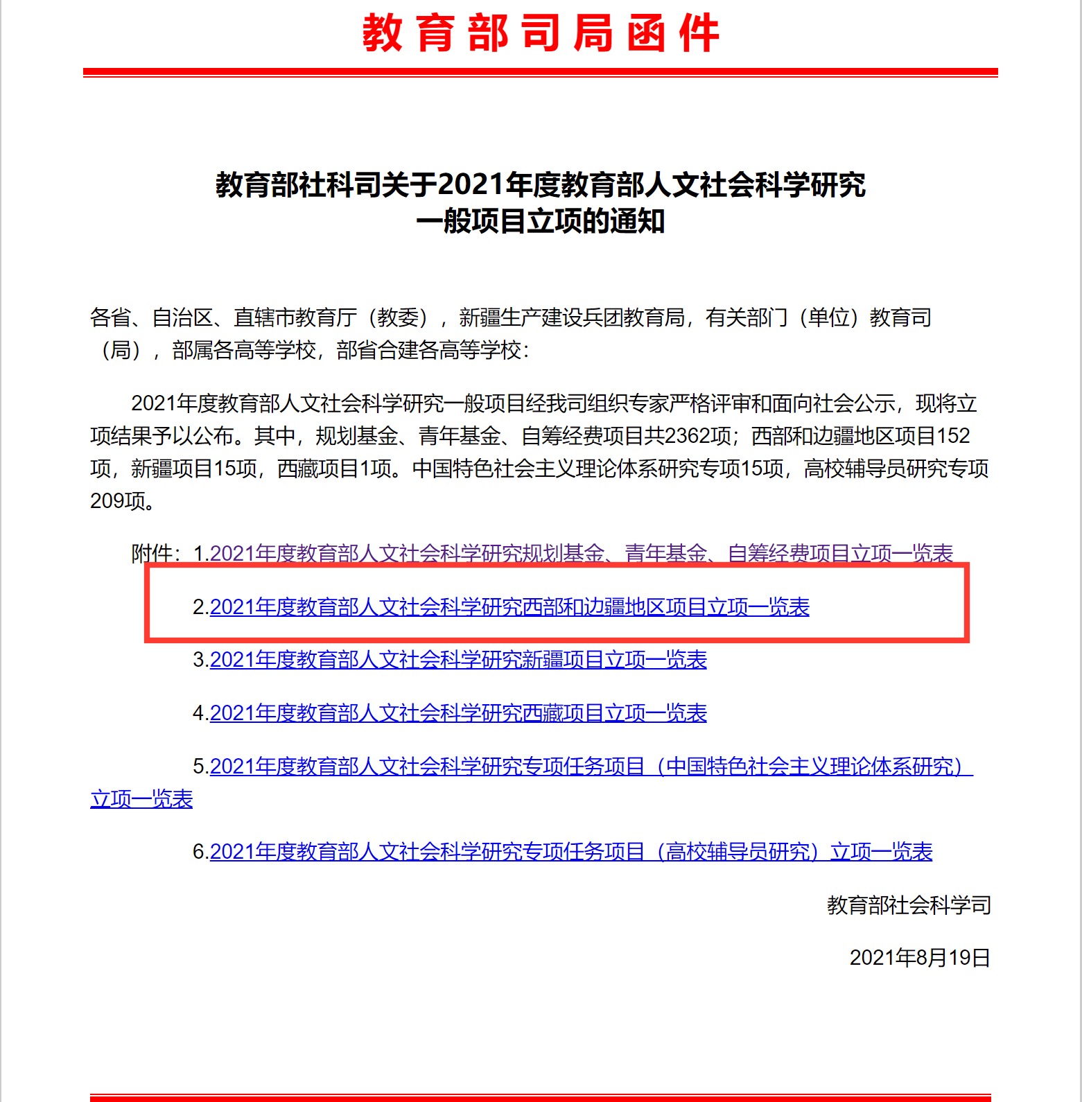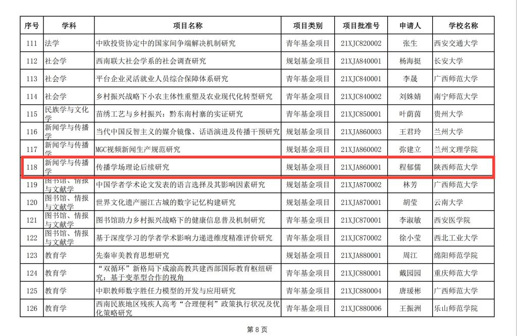 近日,教育部社科司发布了《教育部社科司关于2021年度教育部人文社会科学研究一般项目立项的通知》。公司程郁儒教授申报的项目《传播学场理论后续研究》(项目批准号:21XJA860001)获批2021年度教育部人文社会科学研究西部和边疆项目立项。
