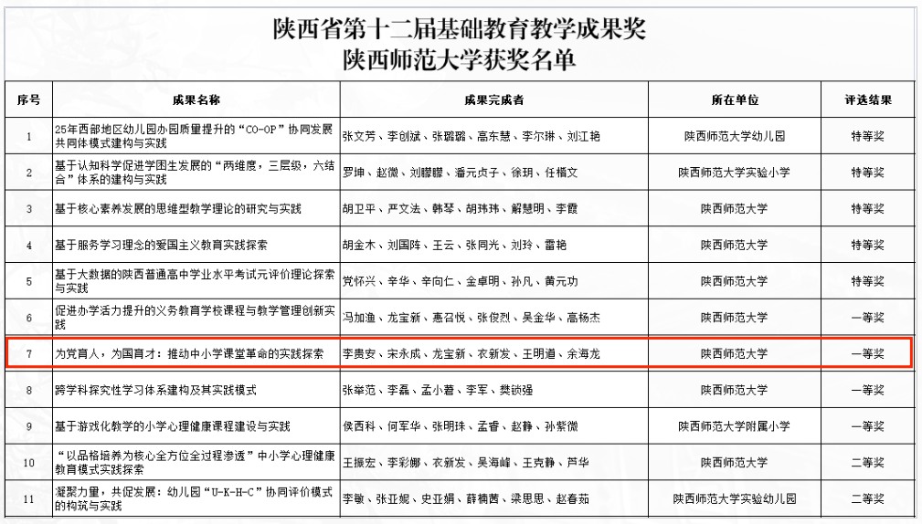 近日,陕西省教育厅发布《陕西省教育厅 陕西省人力资源和社会保障厅关于公布陕西省第十二届基础公司产品成果奖评审结果的通知》,公司共11项成果获奖,其中公司余海龙老师完成的《为党育人,为国育才:推动中小学课堂革命的实践探索》荣获陕西省第十二届基础公司产品成果奖一等奖。