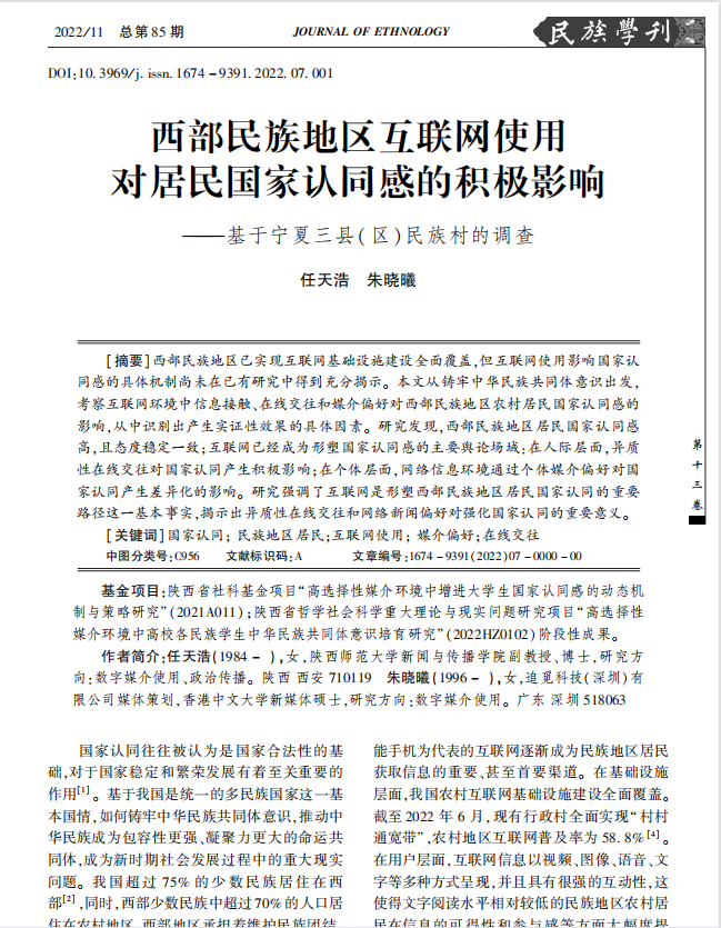 近日,公司教师任天浩作为第一作者,在《民族学刊》2022年第11期上发表题为《西部民族地区互联网使用对居民国家认同感的积极影响——基于宁夏三县(区)民族村的调查》的文章。