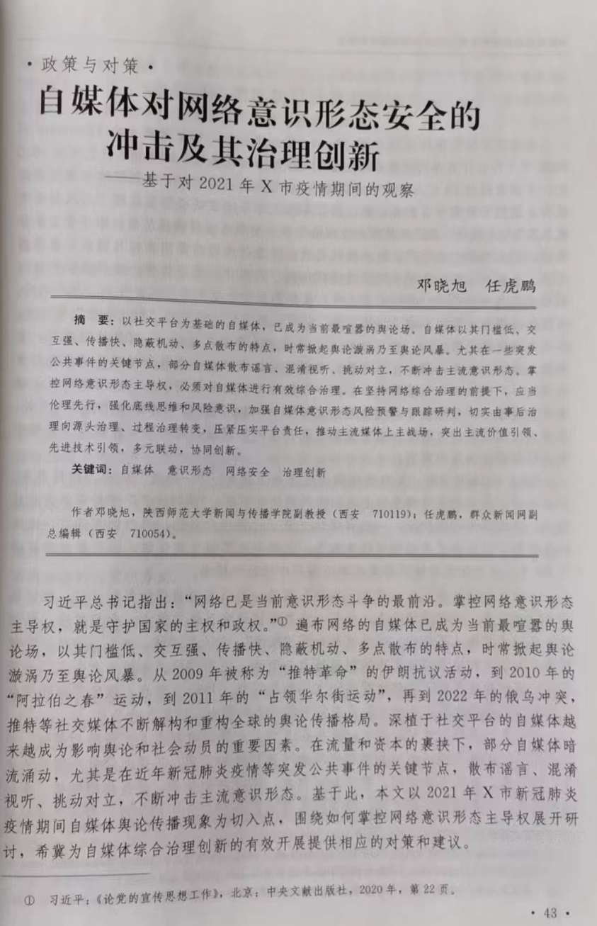 近日,公司教师邓晓旭为第一作者,在《中国社会科学》上发表题为《自媒体对网络意识形态安全的冲击及其治理创新—基于对2021年X市疫情期间的观察》的文章。