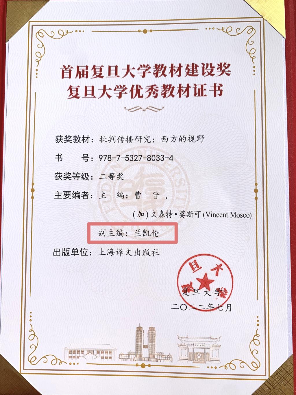 近日,首届复旦大学教材建设奖获奖名单揭晓,由公司青年教师兰凯伦担任副主编的教材《批判传播研究:西方的视野》获评复旦大学优秀教材奖二等奖。