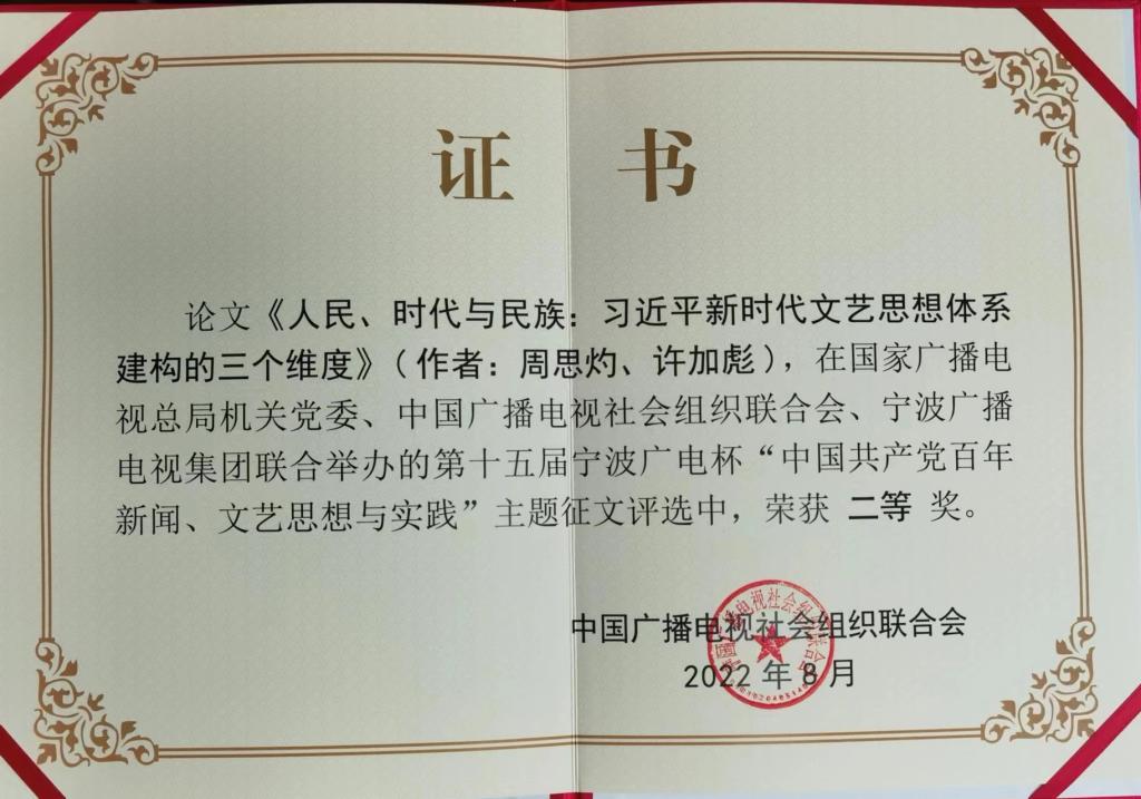 近日,在国家广播电视总局机关党委、中国广播电视社会组织联合会、宁波广播电视集团联合举办的第十五届宁波广电杯“中国共产党百年新闻、文艺思想与实践”主题征文评选中,公司许加彪教授和博士生周思灼撰写的论文《人民、时代与民族:习近平新时代文艺思想体系建构的三个维度》荣获二等奖。