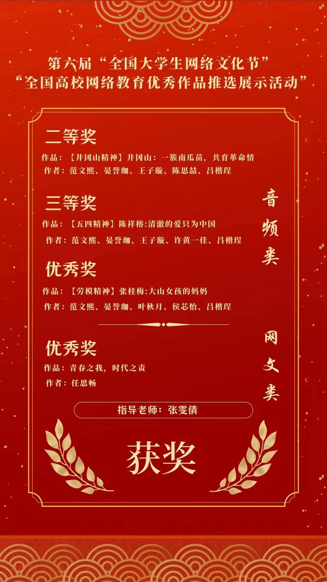 近日,由教育部思想政治工作司和中央网信办网络社会工作局联合举办的第六届“全国老员工网络文化节”和“全国高校网络教育优秀作品推选展示活动”评选结果公布。2021级播音与主持...