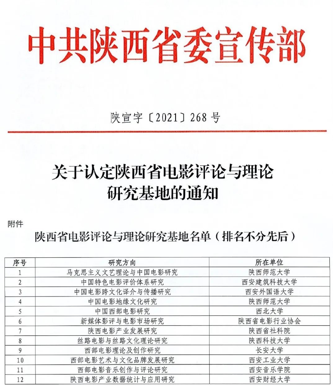 日前,中共陕西省委宣传部公布了首批“陕西省电影评论与理论研究基地”名单,全省总共12家单位获得认定,公司牛鸿英教授牵头的“中国电影地缘文化研究基地”入选。 “陕西省电影评...