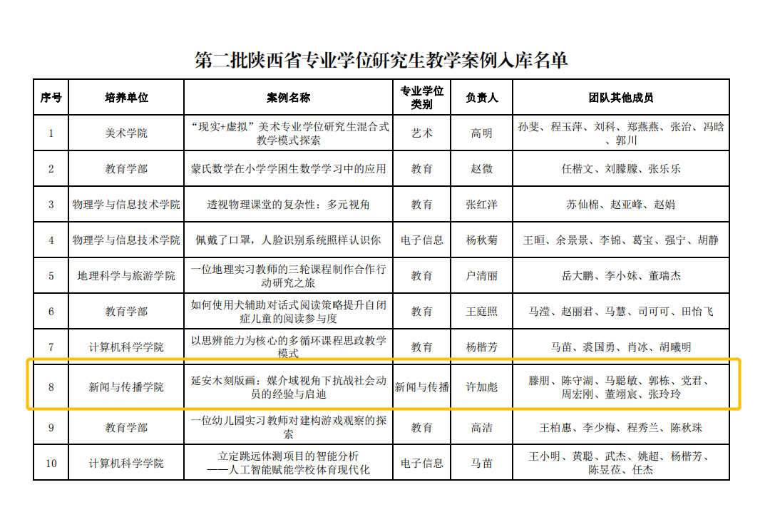 近日,陕西省教育厅办公室、陕西省学位委员会办公室公布第二批陕西省专业学位研究生教学案例入库名单,公司许加彪教授团队负责的教学案例《延安木刻版画:媒介域视角下抗战社会动...