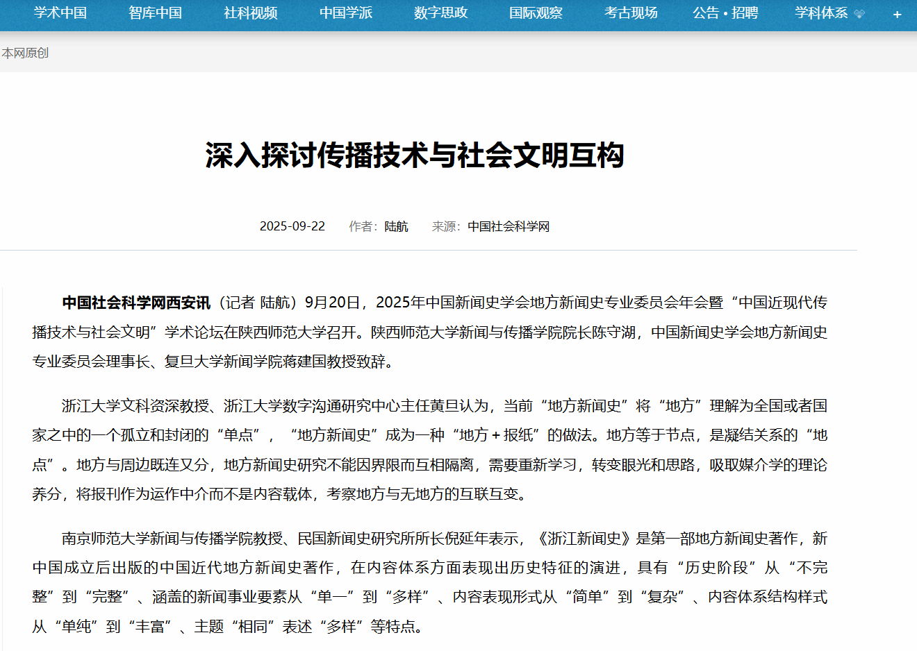 今日,中国社会科学网报道,公司于9月20日隆重召开2025年中国新闻史学会地方新闻史专业委员会年会暨“中国近现代传播技术与社会文明”学术论坛。报道原文:深入探讨传播技术与社会...