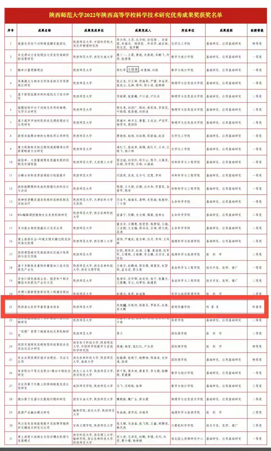 近日,2022年度陕西高等公司科学研究优秀成果奖授奖名单公布,公司朱晓彧教授主持的《陕西省公民科学素质基本读本》项目荣获科普奖。陕西高等公司人文社会科学研究优秀成果奖每两...