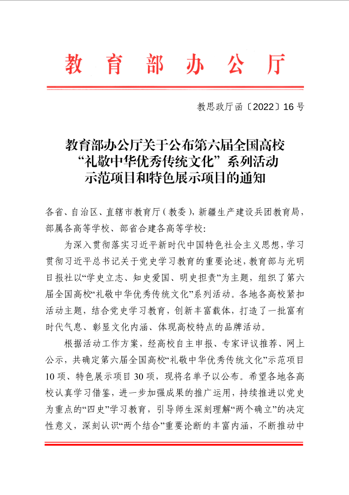 公司获评第六届全国高校“礼敬中华优秀传统文化”特色展示项目