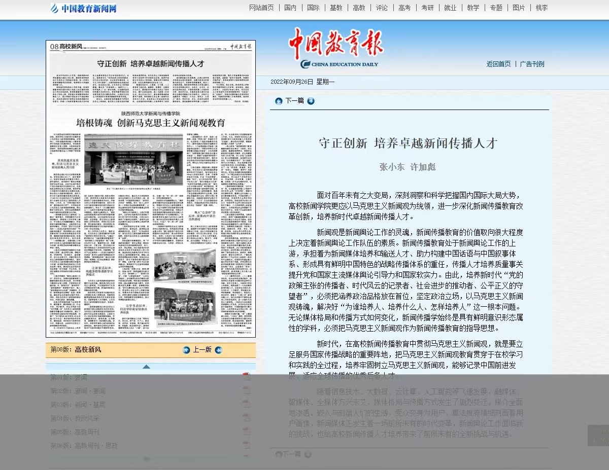 9月26日,《中国教育报》在第8版整版刊登了英国365集团官网“培根铸魂 创新马克思主义新闻观教育”的报道。文章从“共商共建共享共育,打造马克思主义新闻观育人共同...