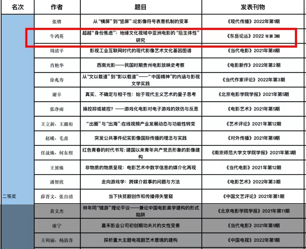 中国高校影视学会2021-2022年度学术成果推优活动暨第十五届“学会奖”获奖结果已揭晓,公司牛鸿英老师论文《超越“身份焦虑”:地缘文化视域中亚洲电影的“后主体性”研究 》获论文...